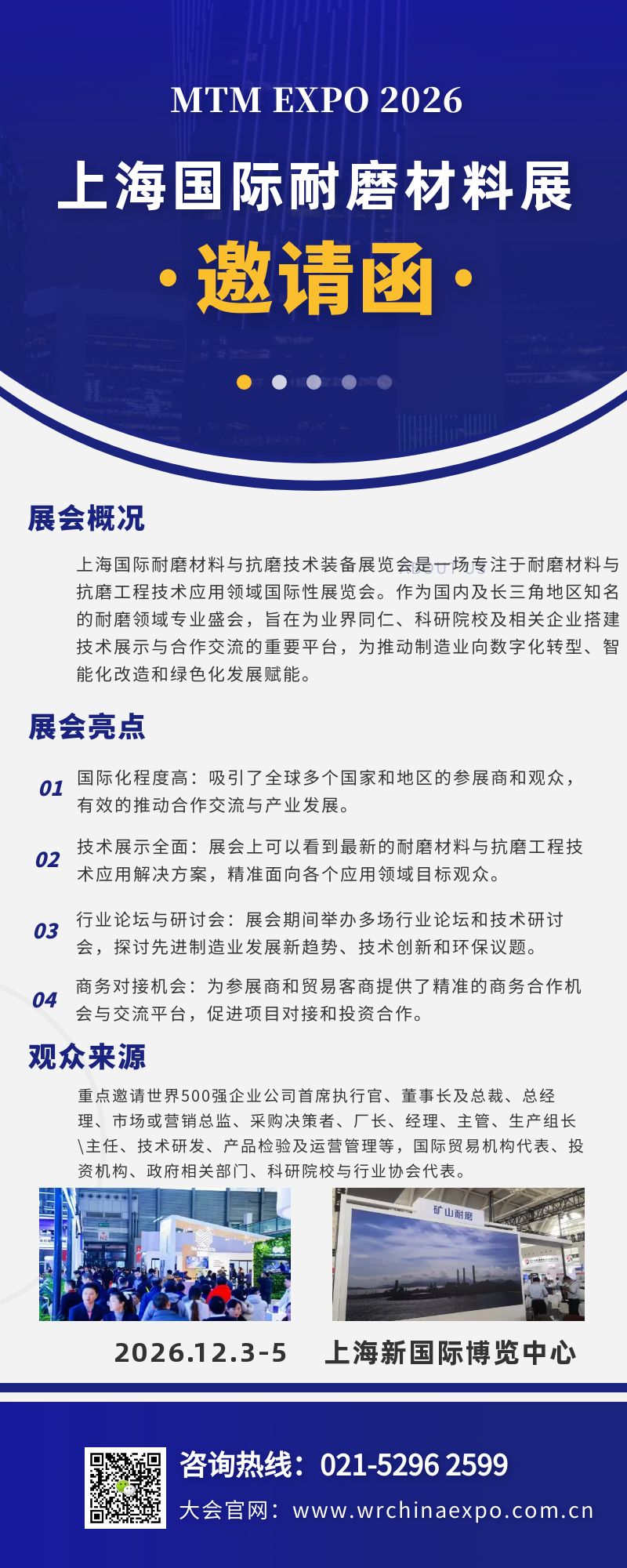 基于以上背景,2026年第十五届上海国际耐磨材料与抗磨工程技术应用展览会将于12月03日--05日在上海新国际博览中心隆重举办。展会同期还将举办多个系列专题展览、行业论坛及技术研讨会等配套活动。现场将重点展示和推广国内外用于钢铁、冶金、铸造、煤炭、矿山、水泥、建材、陶瓷、能源、电力、汽车制造、船舶海工、国防军工、工程机械、石油化工、地下管网、地质勘探、农机装备等产业链上下游企业的新产品、新技术、新工艺和新应用。届时,来自国内外知名学者、世界500强企业、科研院校、行业协会、投资机构、技术人员及贸易客商等代表将齐聚上海,重点围绕宏观经济形势、产业发展路径、关键技术攻关、科研成果转化和应用场景等热点话题进行深入探讨与分享。博览会的举办,旨在广泛汇聚国内外政、产、学、研、用、投等各方优势资源,为业界搭建产业合作、贸易投资、技术交流、市场研判的重要平台,共同为我国耐磨材料企业降本增效与易损件技术升级贡献行业智慧的力量!